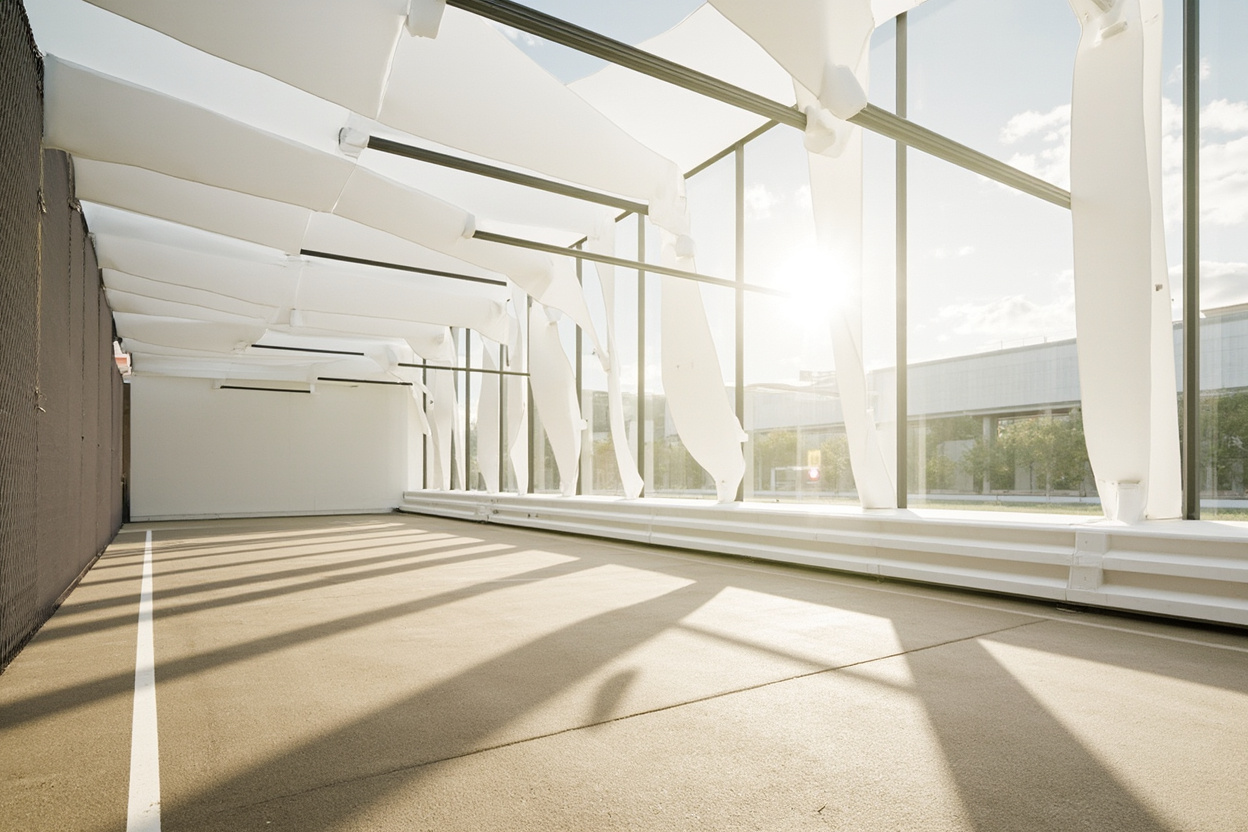 Instalasi rangka, kaca, dan permukaan sintetis.